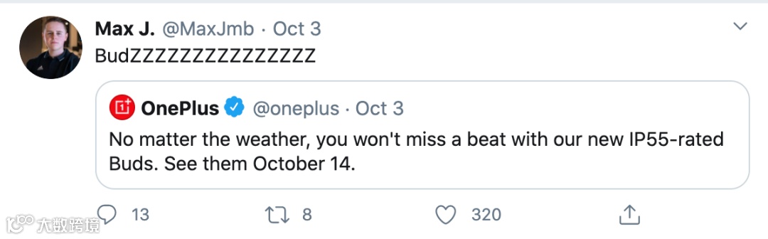 如上图所见,一加官方推特账号预热将于 10 月 14 日推出新款 Buds 系列真无线耳塞,和一加 8T 一起发布。(注:这里的10月14日指的是一加8T的海外发布时间,国行还是10月15日)