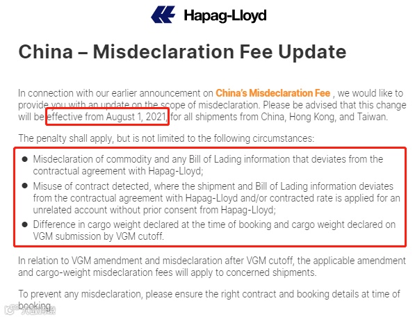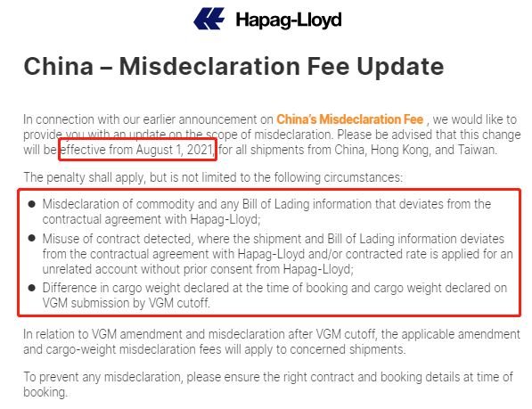 赫伯罗特日前发布通知,在其确认订舱后,赫伯罗特将对货物的错误申报和滥用合同处以每个集装箱1250美元的罚款。
