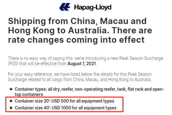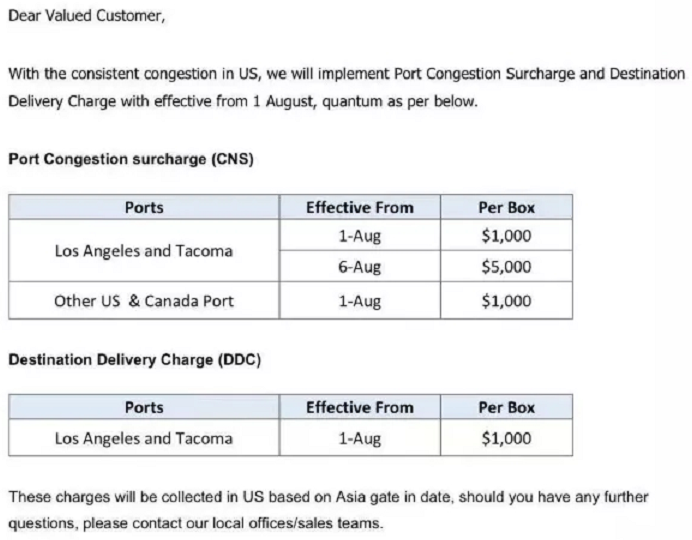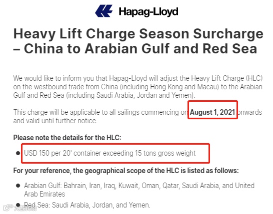 8月15日起,赫伯罗特征收美线5000美元/箱增值附加费; -