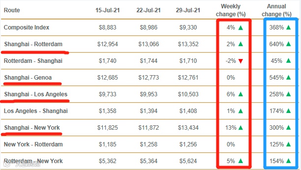 上海-洛杉矶的运价较上周上涨了6%,即550美元,一个40英尺的箱子运价首次突破1万美元达到10503美元,同比大涨258%。