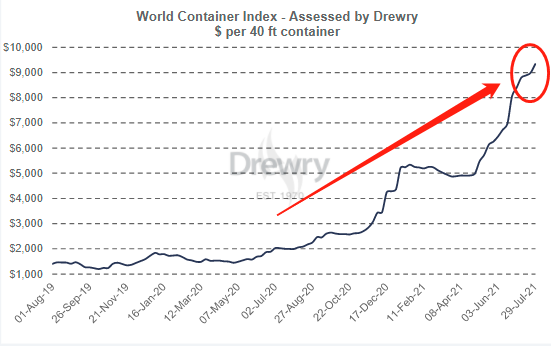 Drewry本期的世界集装箱综合指数(WCI)上涨4%即344美元,达到每40英尺集装箱9330.28美元,比2020年同期上涨368%。
