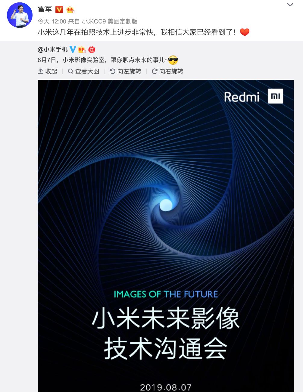 今天上午, 小米官方突然宣布将于8月7日举行「小米未来影像技术沟通会」,并表示将联合小米影像实验室,跟大家聊点未来的事儿,