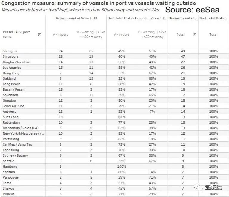 来自海事数据服务商 eeSea 最新发布的一份全球港口拥堵情况显示:近期全球一些主要集装箱港口靠泊船对比等待靠泊集装箱船的比例创出新高!以香港为例,香港等待靠泊集装箱船的比例高达 67%。奥克兰、萨凡纳、西雅图、温哥华也均超过 65%!