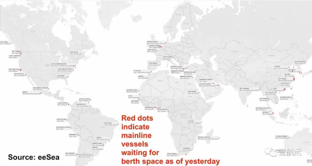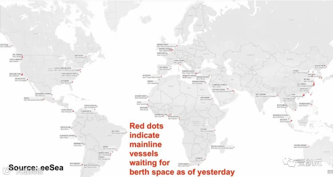 ▲拥堵港口(标红色的)遍布全球!