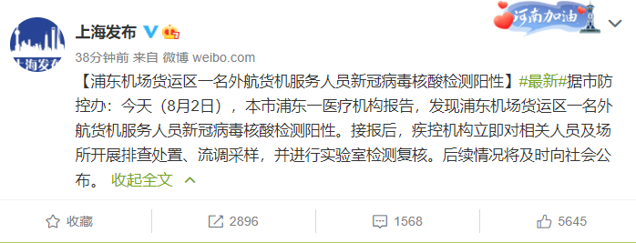 据@上海发布 消息,8月2日,上海市浦东一医疗机构报告,发现浦东机场货运区一名外航货机服务人员新冠病毒核酸检测阳性。接报后,上海疾控机构立即对相关人员及场所开展排查处置、流调采样,并进行实验室检测复核。后续情况将及时向社会公布。