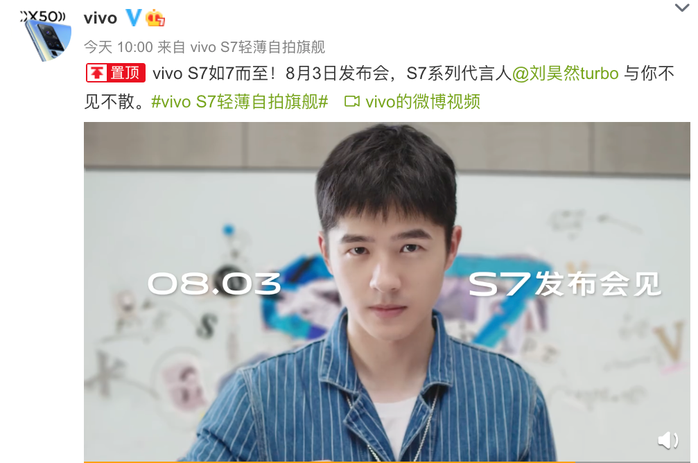 vivo S7将于8月3日19:30发布,Slogan是轻薄自拍旗舰,照亮你的美,代言人依然是刘昊然。