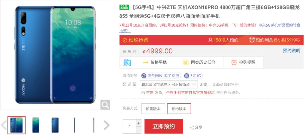 另一边,中兴的5G手机——中兴天机Axon 10 Pro 5G版将于明天上午10:00正式开卖,其6+128GB售价4999元,搭载骁龙855+X50基带实现5G网络支持,支持三大运营商5G频段,目前京东预约人数在1.6万人左右,不知道有多少小伙伴打算入手?🙋♂️