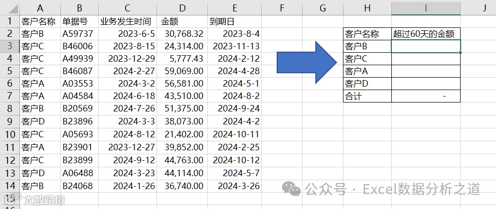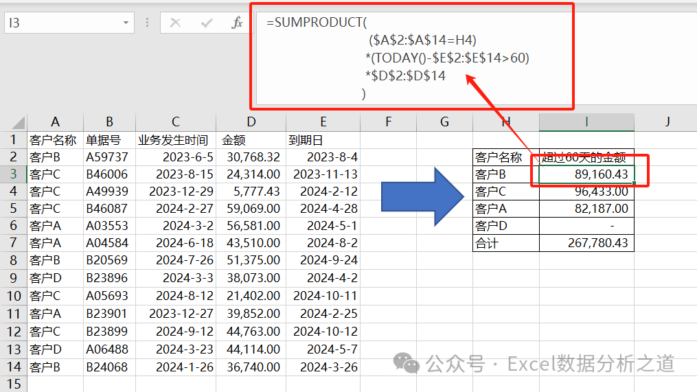这是两个条件的求和,一个条件是判断客户,是显式条件;另一个条件是判断天数是否超过60天,是隐式条件,需要先利用E列到期日计算出天数来才能判断。因此,这个问题不能使用SUMIFS函数。