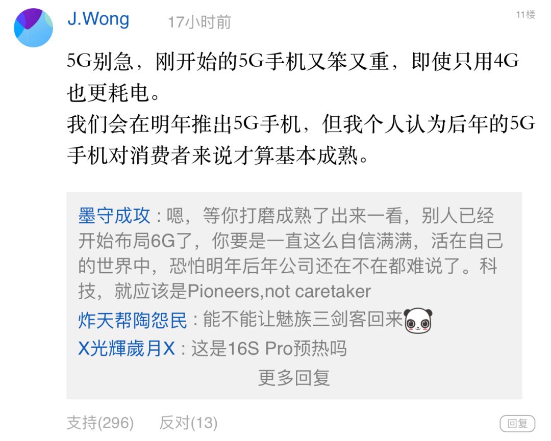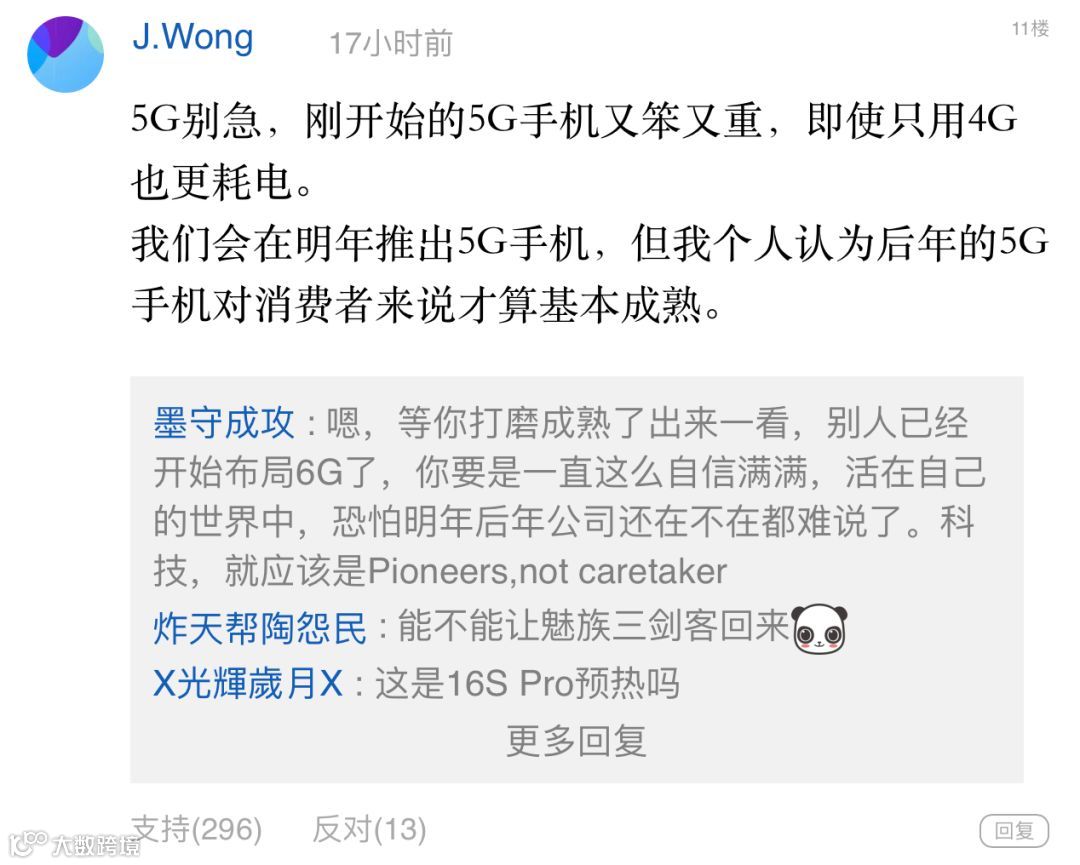 另外,沉寂许久的论坛J.Wong终于回来了~昨日,有魅友在魅族社区问道“魅族什么时候出5G版手机?”,黄章也在第一时间进行了回应。