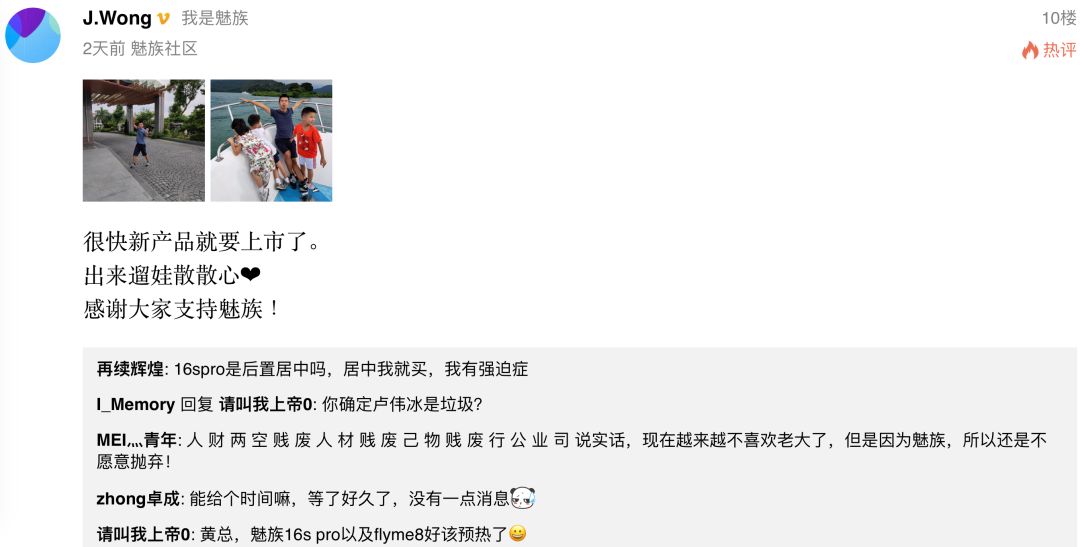 另外,就在两天前,魅族黄章也在论坛罕见地心情不错,晒出了遛娃照,并预热「很快新产品就要上市了」,在魅族深陷负面传闻,多位老员工离职之际,不知道魅族新机能否扭转口碑~