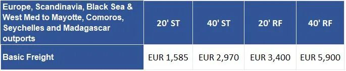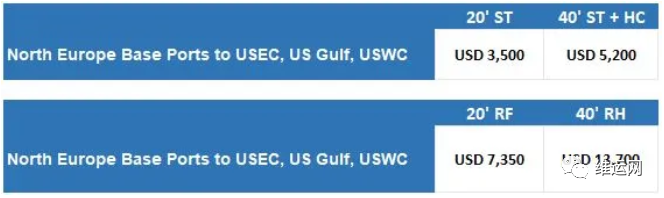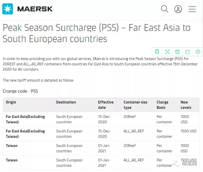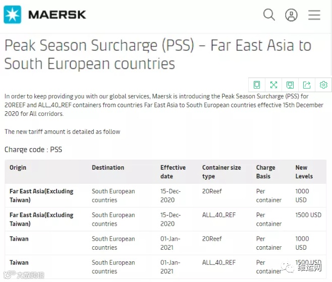 适用于从远东到北欧和南欧国家的冷藏货物。附加费将为$1000/ 20'冷藏箱,$1500/40'冷藏箱,并将于12月15日生效,台湾PSS将于2021年1月1日生效。