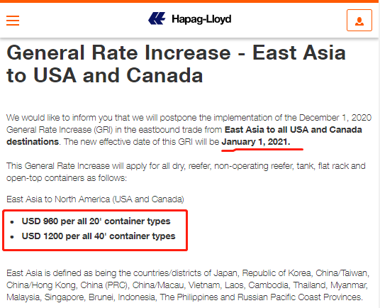 根据当前的市场状况,赫伯罗特将从2020年12月7日起提高从东亚到南美东海岸的所有货物和所有集装箱类型的GRI费率,每个集装箱550美元。