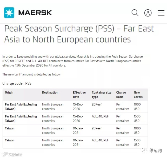 马士基宣布已于12月至明年在欧洲和东亚地区征收一项新的旺季附加费(PSS)。