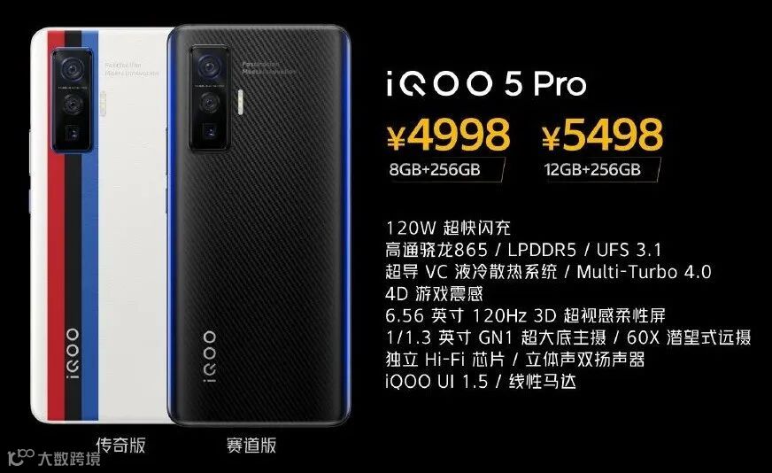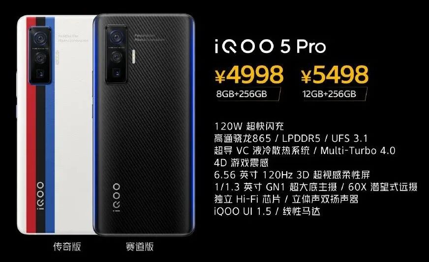 细节上,需要注意的是,iQOO 5 Pro这次两款配色均为宝马BMW M Motorsport联合设计版,「赛道版」黑色碳纤纹理AG+两侧渐变蓝光,「传奇版」白色素皮+BMW M Motorsport三色标记 。个人觉得白色素皮版颜值非常不错,虽然实体使用「可能」会出现一些卫生问题,但白色素皮+宝马的logo感觉逼格满满。