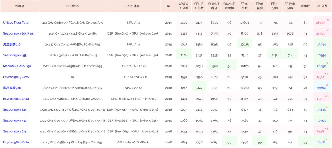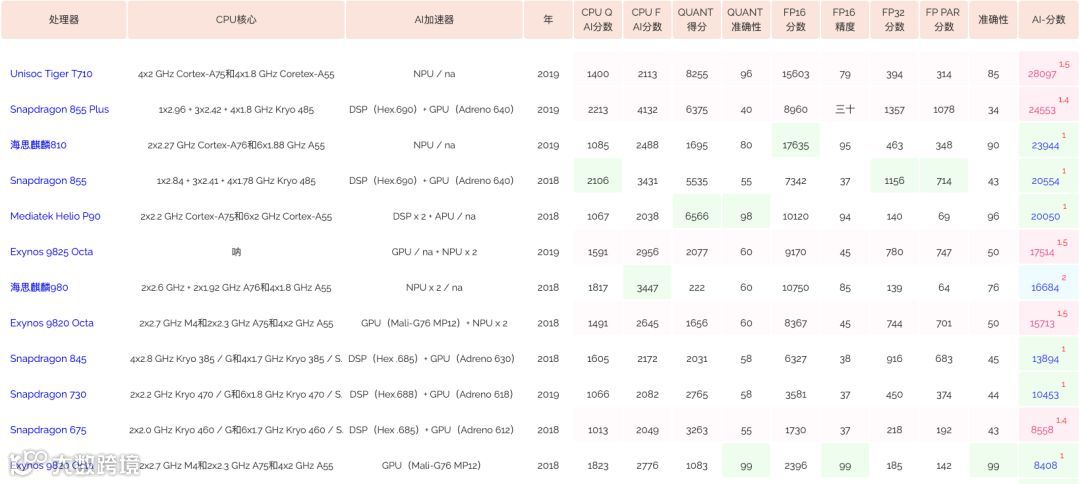 目前AI跑分排名第一是紫光展锐虎贲T710,28097分;第二名则是高通骁龙855 Plus,24553分;华为麒麟810位列第三,跑分为23944。值得一提的是,榜首这颗虎贲T710来自的紫光展锐也是国产品牌。