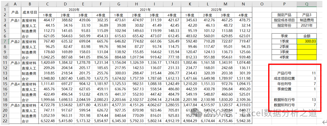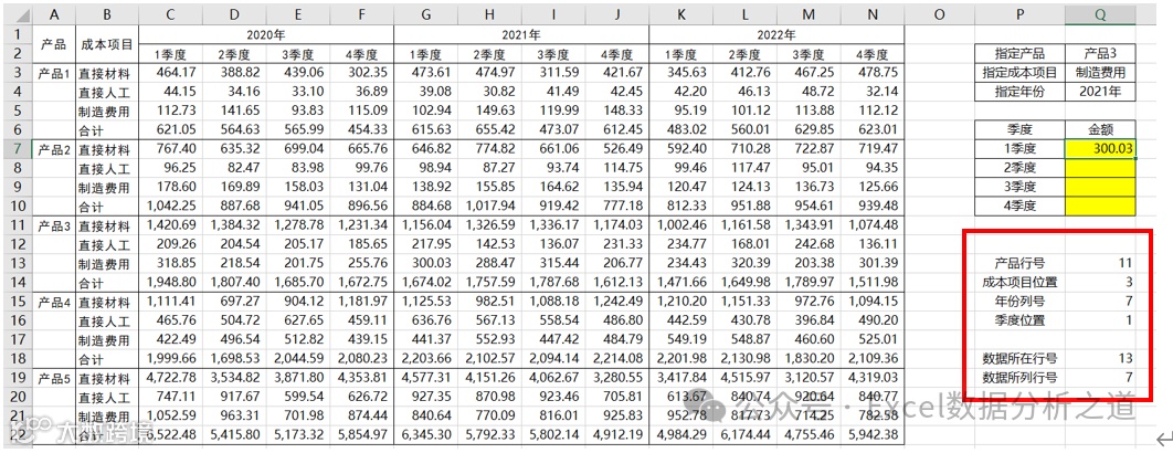 条件1和条件2组合,可以得到指定产品、指定成本项目的行号;条件3和条件4组合,则可以得到指定年份、指定季度的列号。