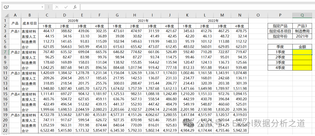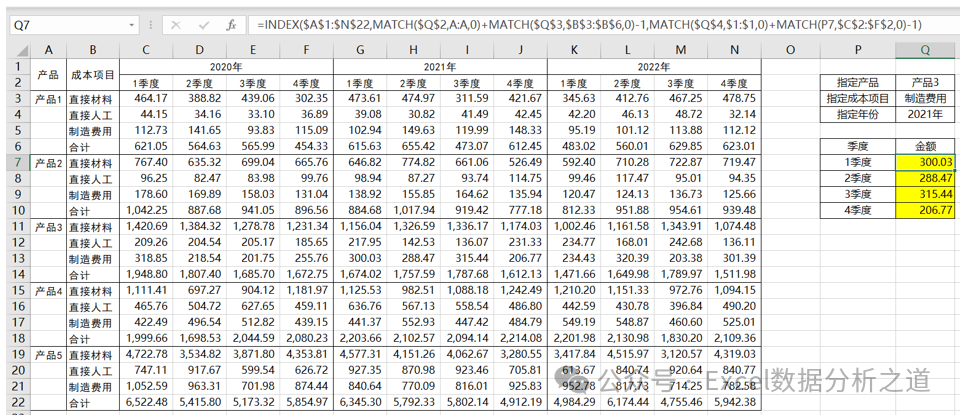 以指定产品、指定成本项目、指定年份下,1季度的数据查找(单元格Q7)公式为例,分解综合法的具体步骤如下。