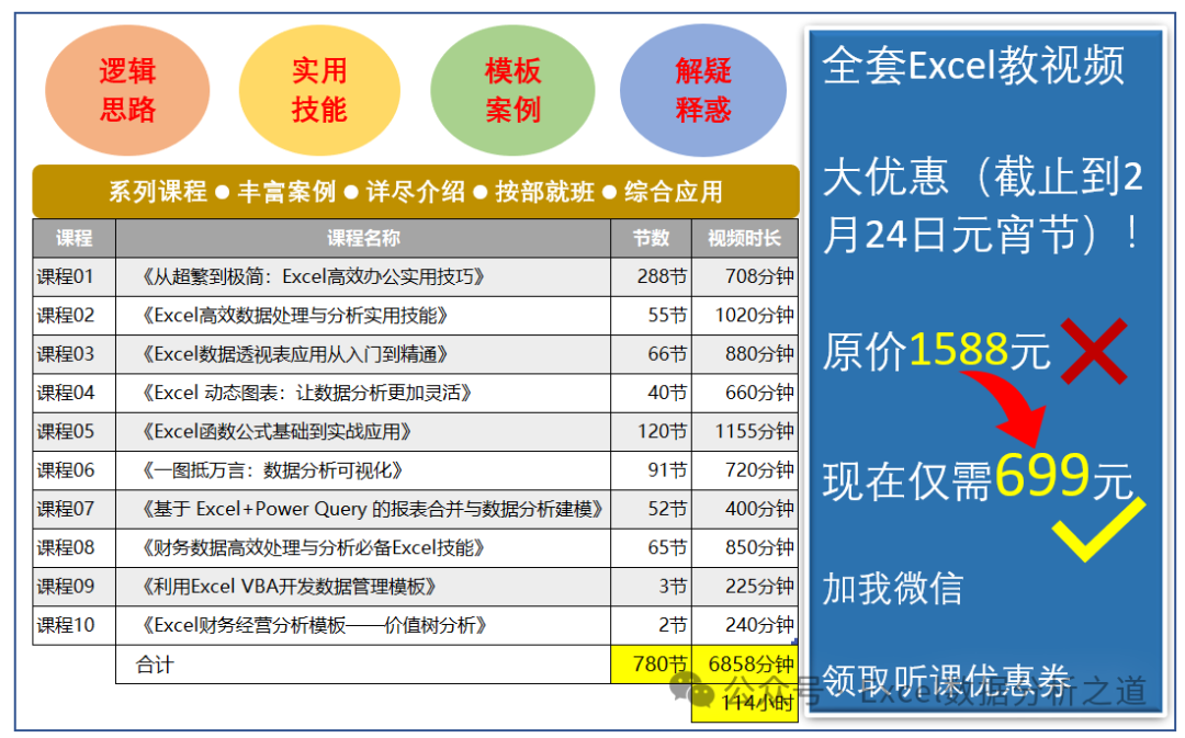 从即日起到2024年2月24日元宵节前,千聊视频大优惠,原价1588元/年,现价699元/年,就能不限次数观看录播的10余门课程,上百小时的全套Excel学习视频。