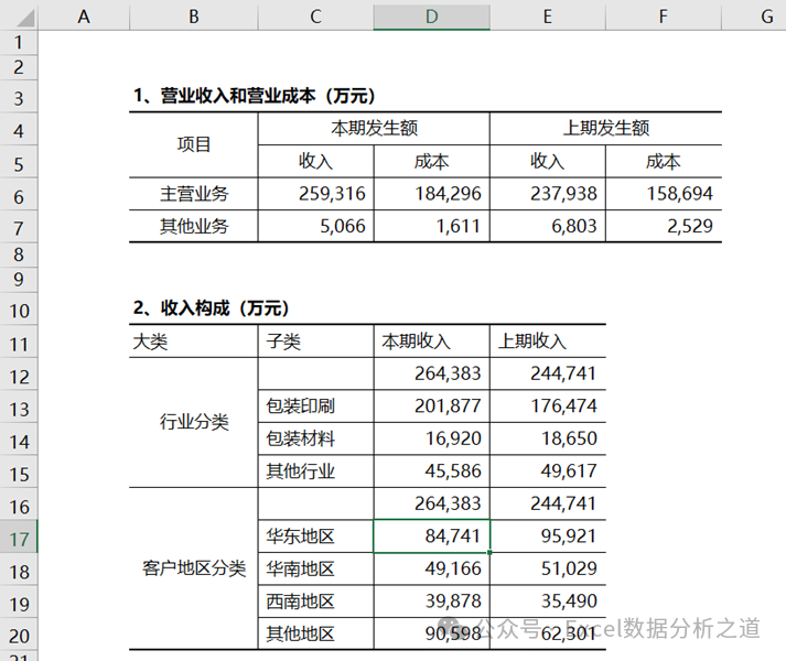 有这样两个统计表,分别是公司收入和成本的两年数据,以及收入结构的两年数据。那么,对于这样的表格,我们如何用更加清晰的形式展示出来,让我们一目了然发现,公司这两年的经营出现了什么样的变化?