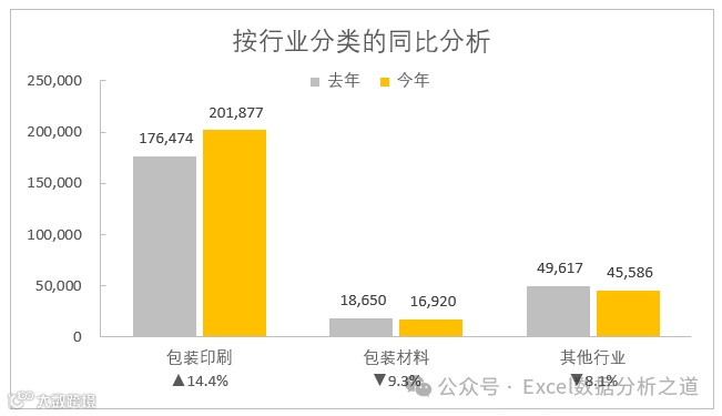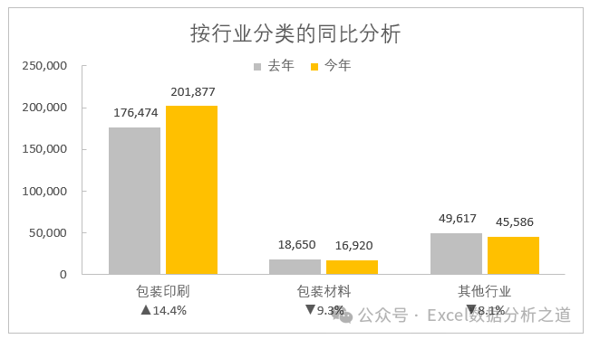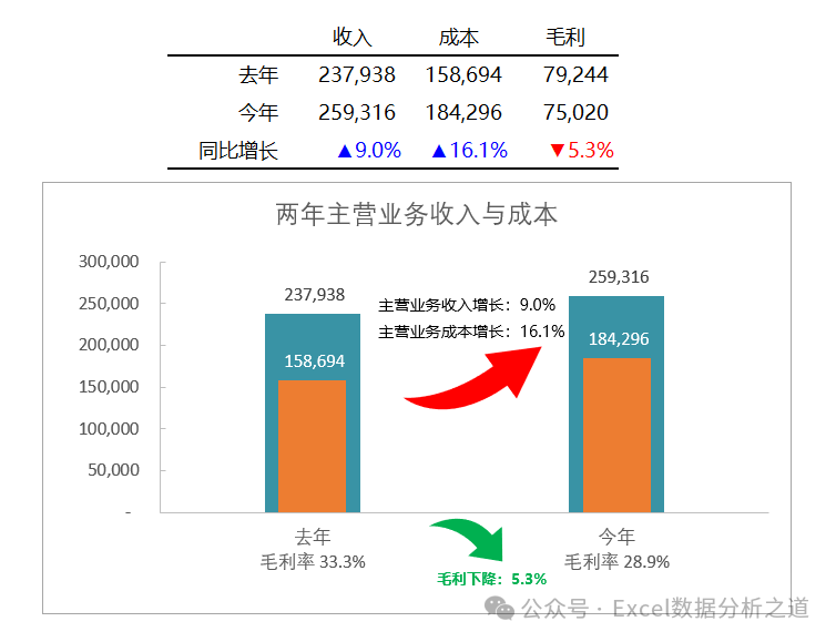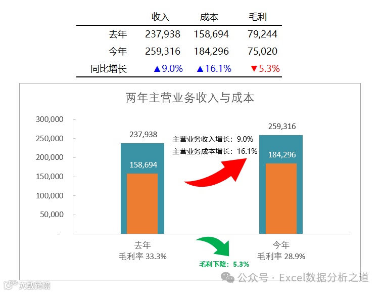 单独从表格数字看,数字并不能给我们一个清晰展示。例如,对于表1,两年的主营业务收入增长情况如何?毛利率变化情况如何?如果将表格进行进一步的处理,使用自定义数字格式来标识两年增长情况,同时绘制如下所示的图表,那么就一目了然看出两年增长情况了。