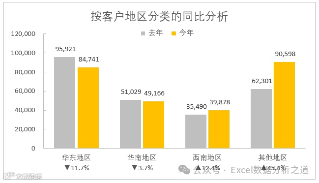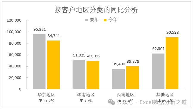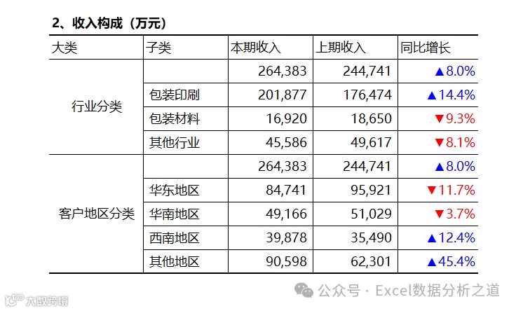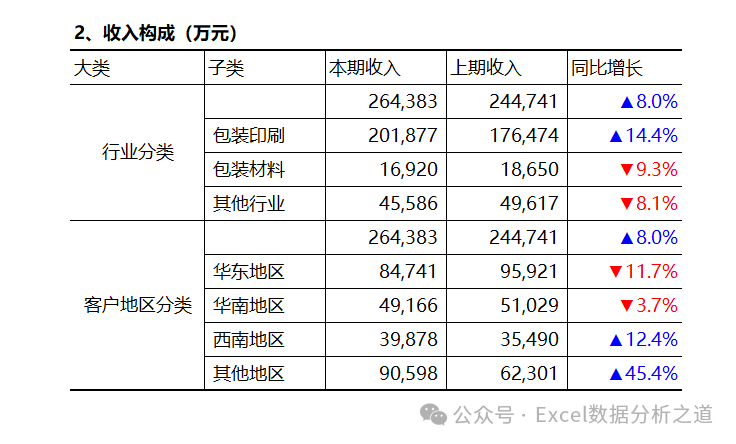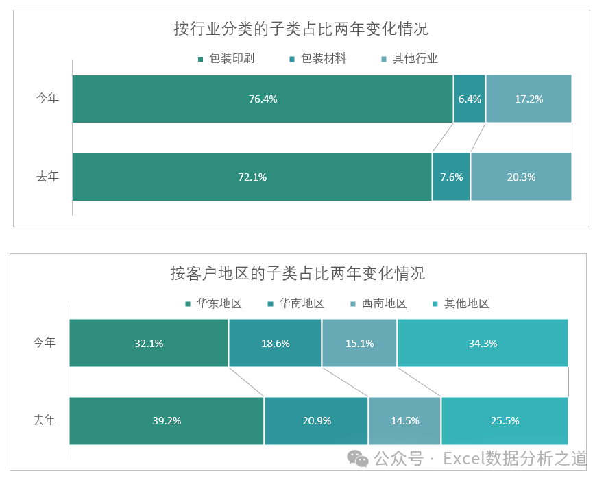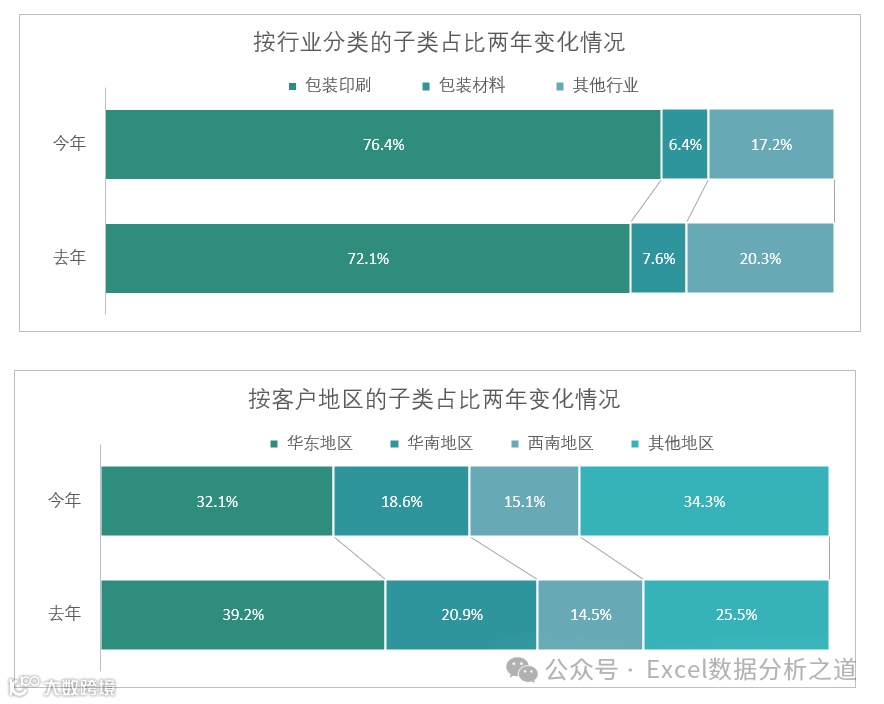 对于第二个表格,反映的是产品销售的行业分类结构和客户地区结构,这些信息,给出了公司产品的结构是否合理,以及各个地区市场销售分布,反映了公司的销售策略,以及产品结构和地区分布在两年的变化情况。但是,从这个表格来看,要想快速了解这样的信息,是很费劲的。