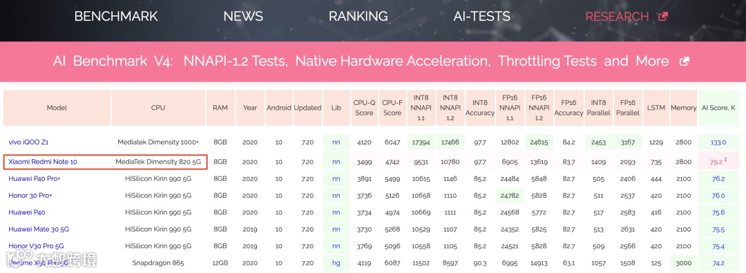 如上图所见,名为「Redmi Note 10」的新机搭载联发科天玑820,在AI跑分榜排名第二,仅次于联发科天玑1000Plus,难不成这是Redmi的新机?