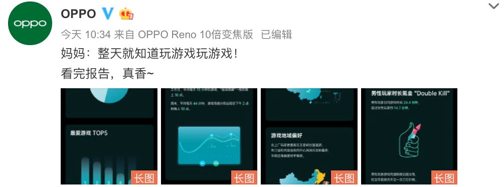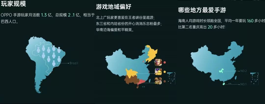 OPPO手游玩家平均每天游戏时间为18.5分钟,75%玩家每天只玩20分钟以内,工作日平均每天15分钟玩游戏,团战高峰在晚上10点,而周末平均每天44分钟,游戏高峰除晚上外还有下午2点。