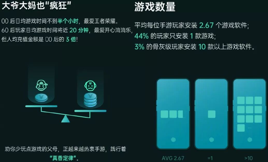 据OPPO官方数据,OPPO手游玩家月活数1.3亿,总规模2.1亿(里面有多少一加的自行感知),男女比例54%:46%,最爱游戏TOP 5依次为王者荣耀、和平精英、开心消消乐、迷你世界、欢乐斗地主;平均每位手游玩家安装2.67个游戏软件。