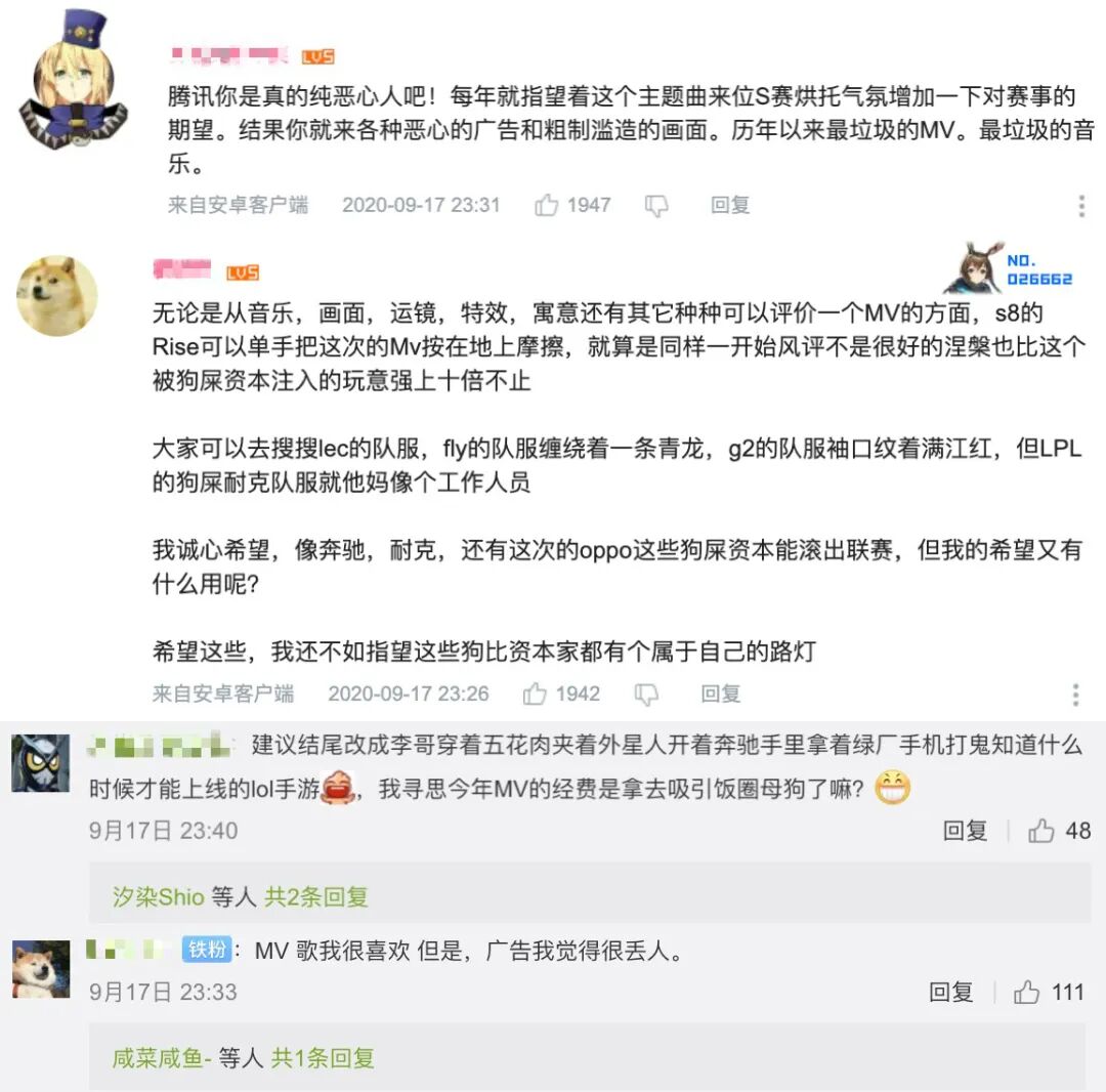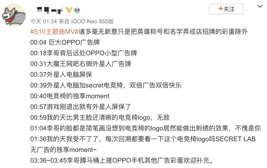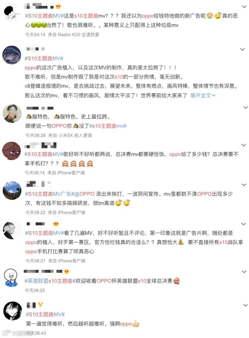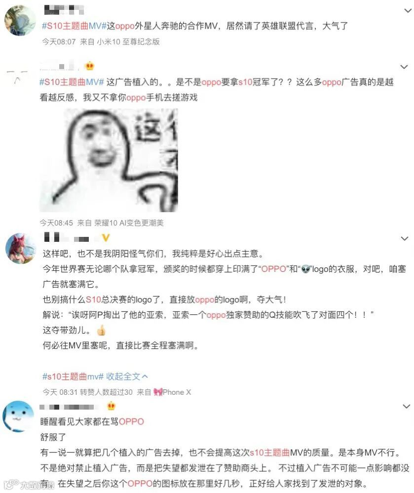 9月17日昨晚23点,英雄联盟官方账号发布了 《所向无前:2020全球总决赛主题曲MV》,时长3分45秒,但MV植入了几个赞助方(包含OPPO)的镜头,然后OPPO官博评论区和微博广场实时搜索被骂出翔。