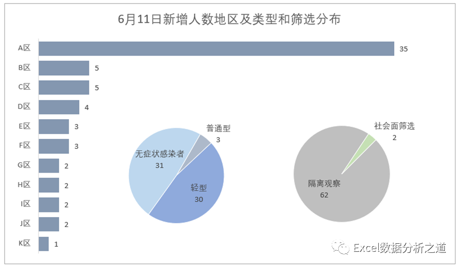 “我市上午召开第***场新冠肺炎疫情防控工作新闻发布会。发布会上通报,6月11日0时至24时,新增本土新冠肺炎病毒感染者64例,A区35例,B区、C区各5例,D区4例,E区、F区各3例,G区、H区、I区、J区各2例,K区1例;普通型3例,轻型30例,无症状感染者31例,隔离观察人员62例,社会面筛查人员2例。”