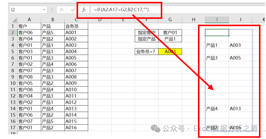 将表达式 IF(A2:A17=G2,B2:C17,"") 的结果(数组)作为VLOOKUP函数的第二个参数,在这个数组的第一列匹配产品,在第2列提取业务员,就是指定部门、指定产品下的业务员了。
