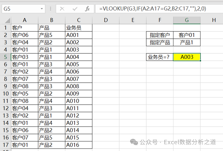 下面看一个例子,要求查找指定客户、指定产品的业务员姓名。可以设计如下的查找公式: