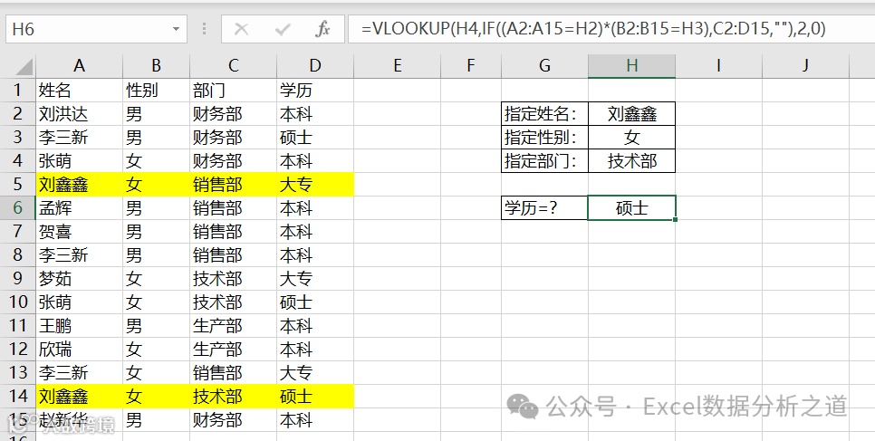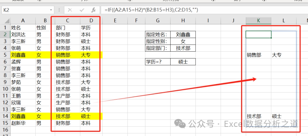 表达式 IF((A2:A15=H2)*(B2:B15=H3),C2:D15,"") 就是判断A列是否为指定姓名、B列是否为指定性别,两个条件都满足时,将C列和D列数据留下来,生成一个不同部门的数组,再使用VLOOKUP函数在这个数组的第一列匹配部门,在第2列提取学历。