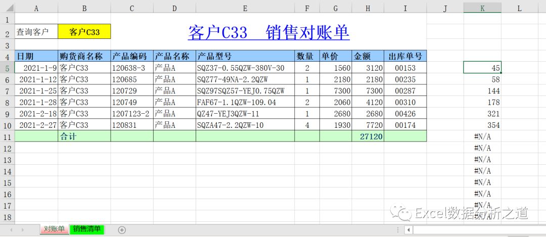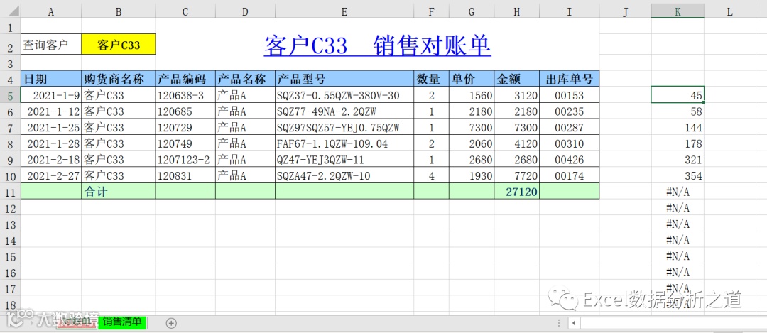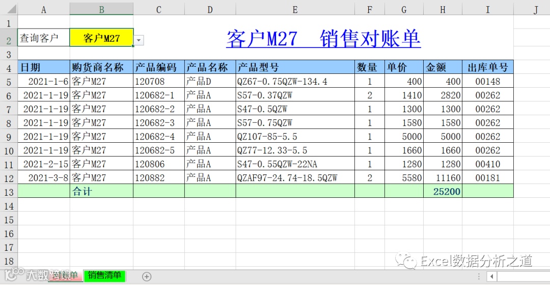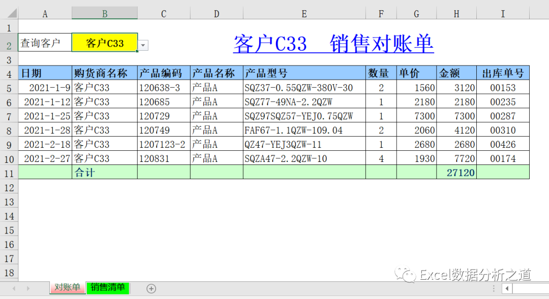 这样,就制作完成了动态的客户对账单的模版。只要在单元格B2选择输入任意客户名称,就自动得到该客户的明细数据。