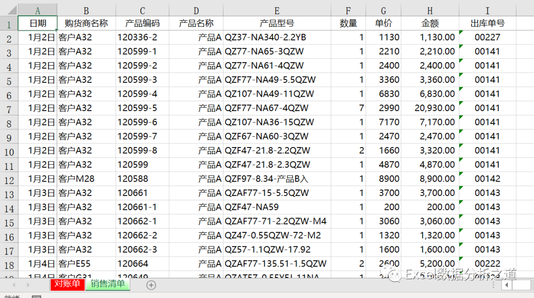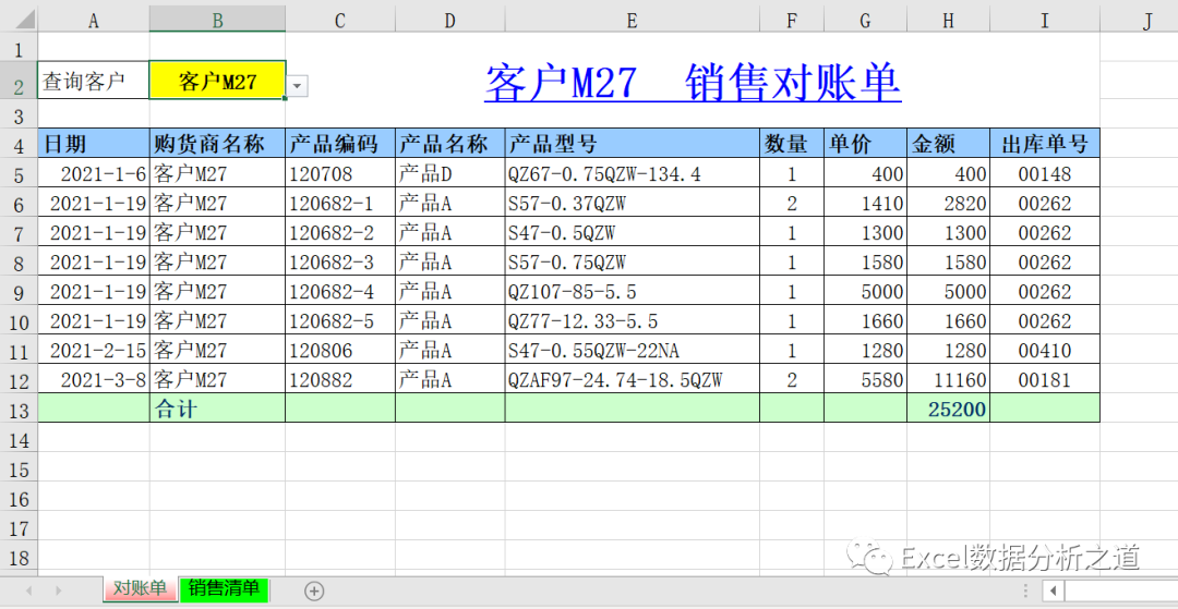 下图是一个销售清单,现在要求制作一个对账单表格,把某个指定客户的所有销售明细查找出来。
