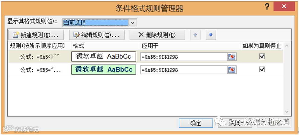 步骤6:选择单元格区域A5:I2000,设置两个条件格式: