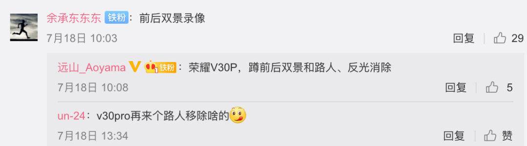 有留言希望荣耀X10可以OTA小窗功能、90Hz动画、隐私空间、密码保险箱等功能,还有荣耀V30 Pro用户也现身表示希望可以再来个前后双景录像、路人移除等功能。