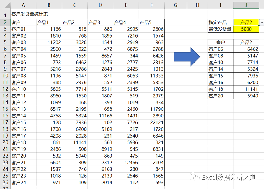 下图是一个示例,要求筛选出指定产品、指定最低发货量以上的客户数据。