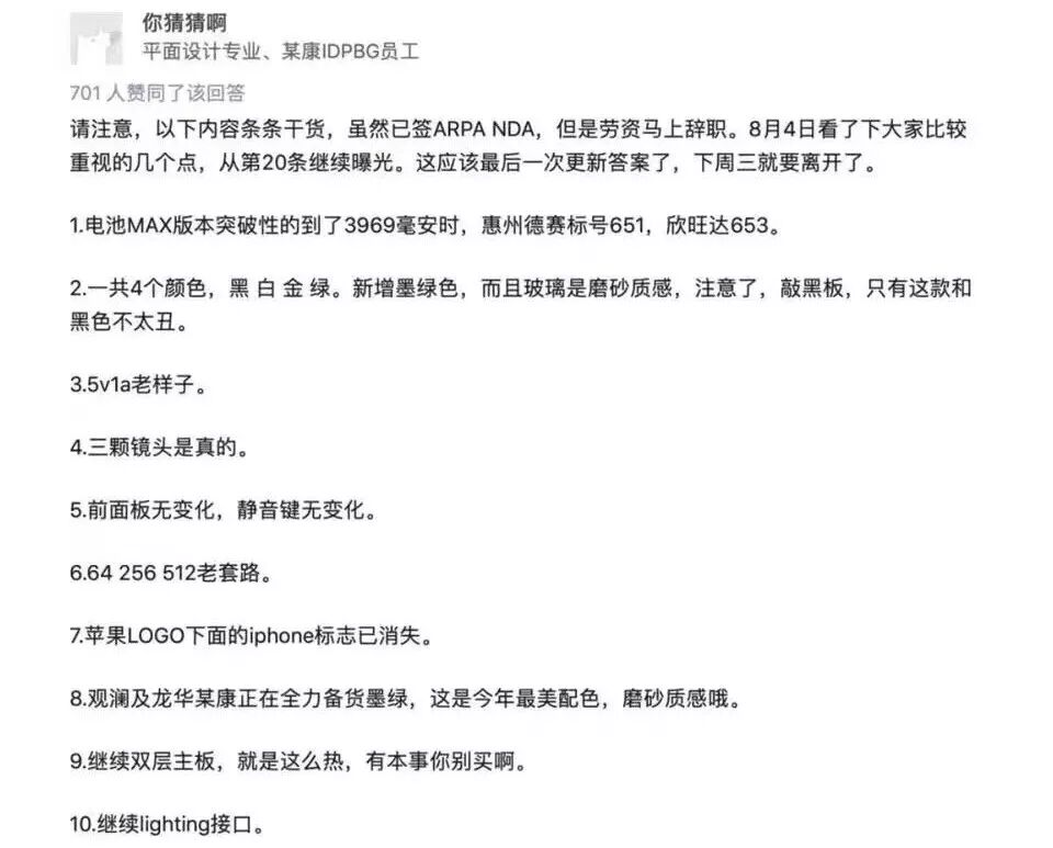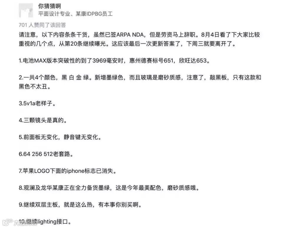 最后是一些新iPhone的内部消息,某即将离职的富士康员工在知乎对各种细节进行了爆料,真实性算是稳了。(不过看到这条脑海里第一反应还是是兄弟够胆就不担心违反保密协议的后果...希望好运吧 唉)