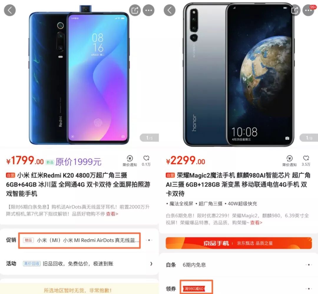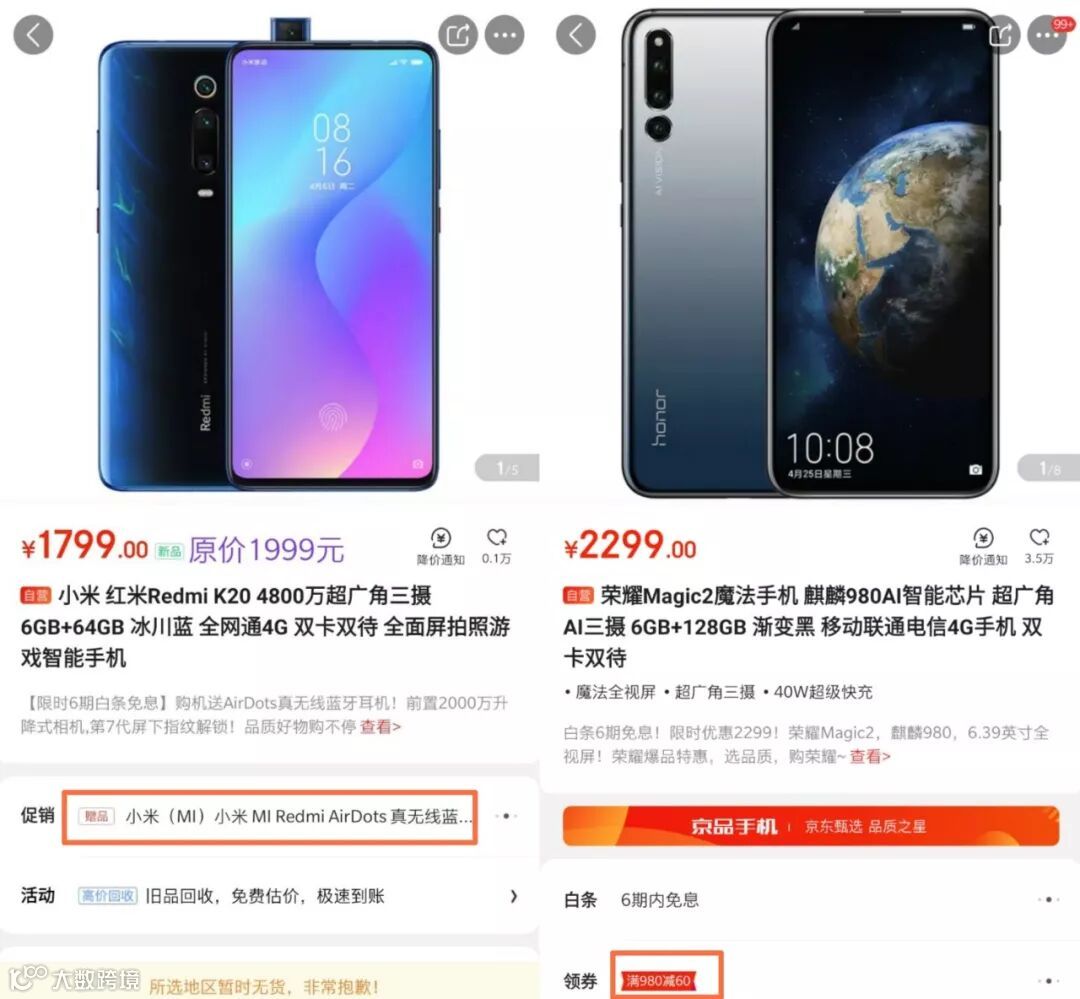 此外,红米Redmi K20 6+64GB版也直降200元并送AirDots无线耳机,荣耀Magic 2 8+128GB可领取500元优惠券到手2199元(小白查看时券已无)。其中红米K20配置有:6.39英寸屏+第7代屏幕指纹,骁龙730,升降弹出式前置20MP,后置三摄索尼48MP+8MP+13MP超广角,4000mAh,18W快充等。