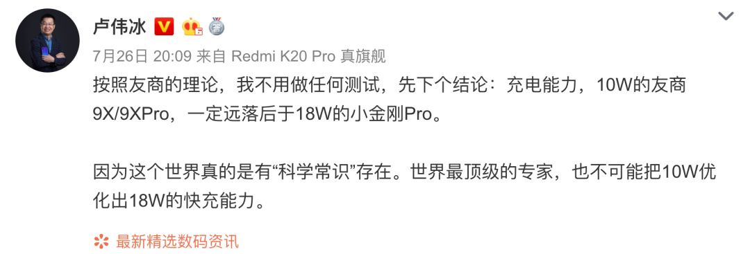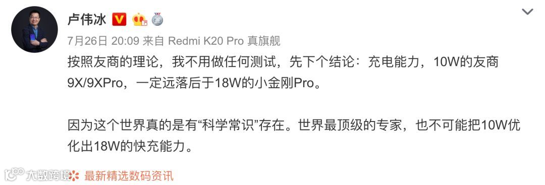 如上图所见,Redmi卢伟冰表示:“按照友商的理论,我不用做任何测试,先下个结论:充电能力,10W的友商9X/9XPro,一定远落后于18W的小金刚Pro。世界最顶级的专家,也不可能把10W优化出18W的快充能力。”