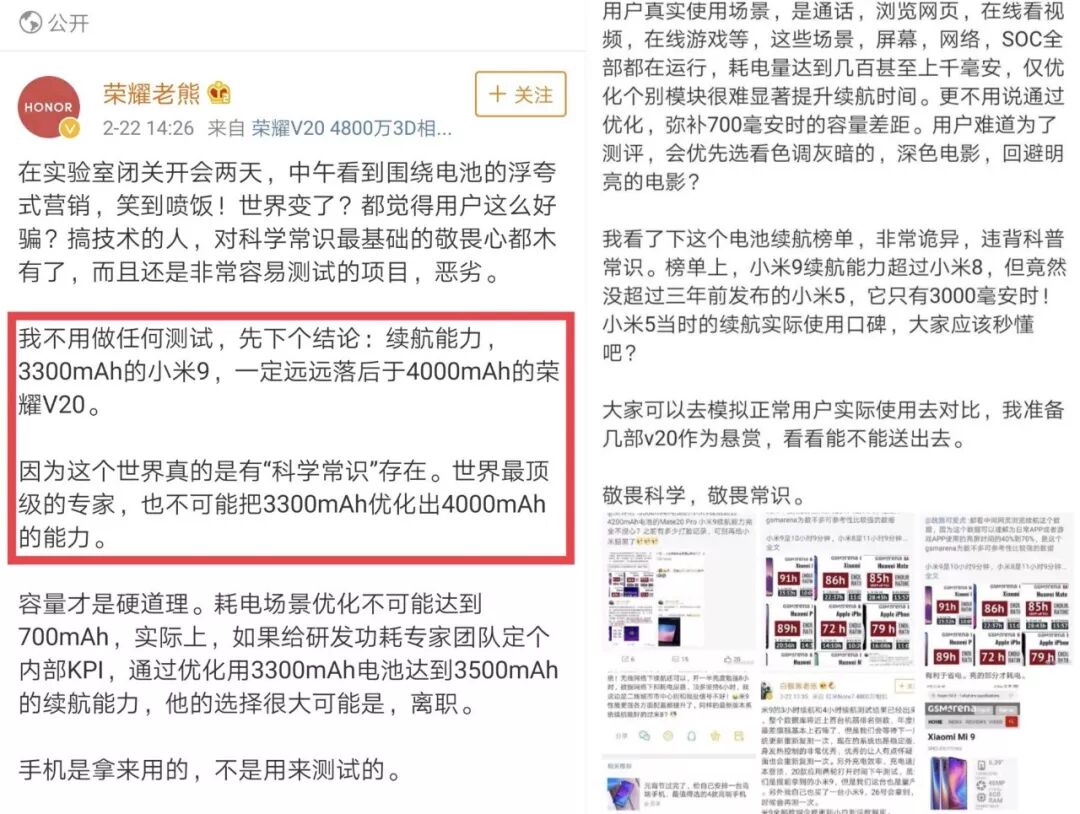 而卢伟冰所提到的友商理论,正是年初小米刚发布不久时,荣耀老熊吐槽小米9电池3300mAh续航肯定不如4000mAh的荣耀V20所组织的语言,如果是作为一个纯粹的路人,这下以其人之道还治其人之身秒得很。(虽然从头到尾荣耀没回应过小米...