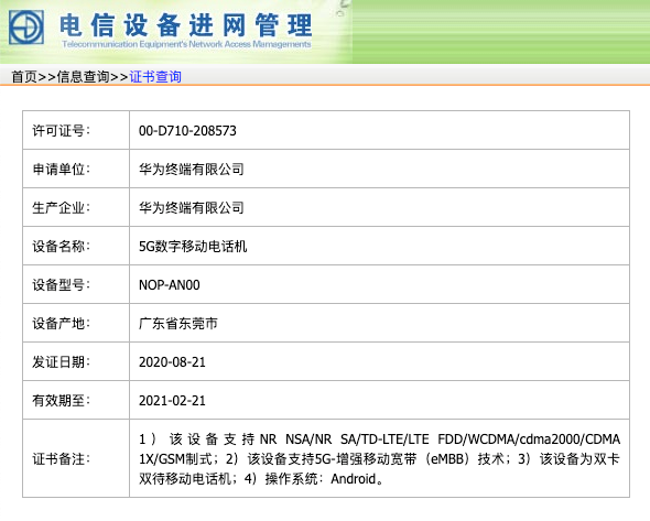 如上图所见(左右滑动↔️查看3张),型号为OCE-AN00、NOH-AN00、NOP-ANOO的三款华为5G新机于8月21日(今天)刚刚拿到入网许可证,界面显示三款均支持NSA和SA双模5G,Android系统。预计对应的分别是Mate 40标准版、Mate 40 Pro、Mate 40 Pro保时捷设计版。