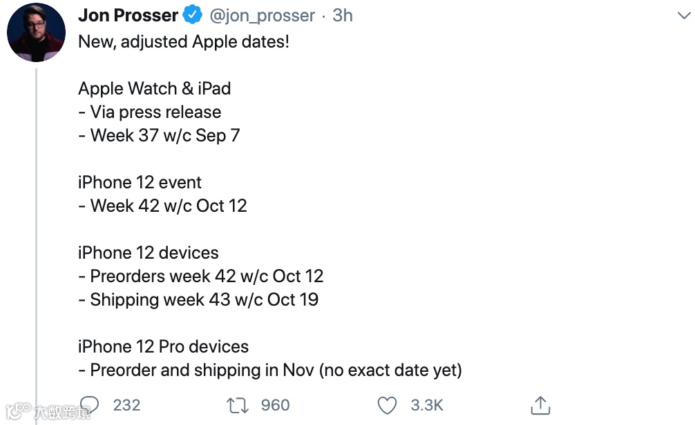 作为参考,早前爆料达人JonProsser曾称:①9月7日 官网发布Apple Watch 6和新iPad;②10月12日,iPhone 12系列正式发布,iPhone 12开启预售;③10月19日 iPhone 12正式发售;④11月具体日期不清楚:iPhone 12 Pro系列预售+发售。感兴趣的小伙伴自行参考下吧。
