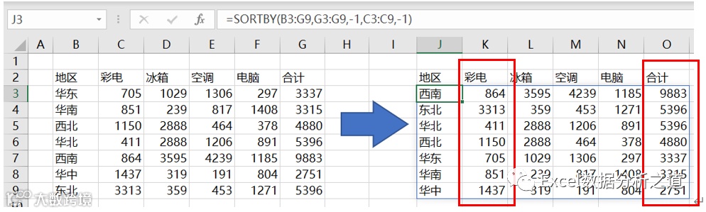 第3个参数和第4个参数,指定了第2组排序条件(C3:C9,彩电数据列)及排序方式(-1)。