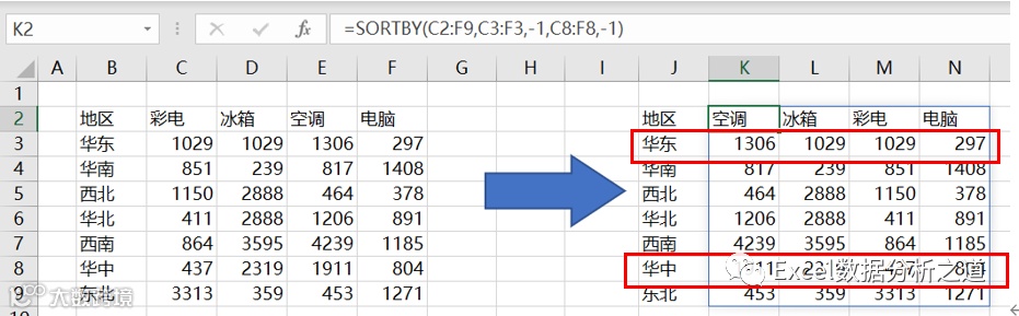 第2个参数和第3个参数,指定了第1组排序条件(C3:F3,华东地区数据行)及排序方式(-1)。