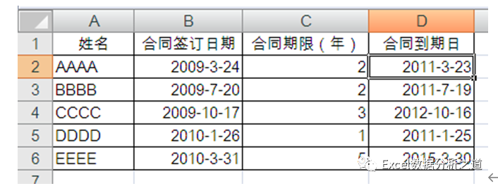 图1-93是计算合同到期日的表格,其中单元格D2的计算公式为: