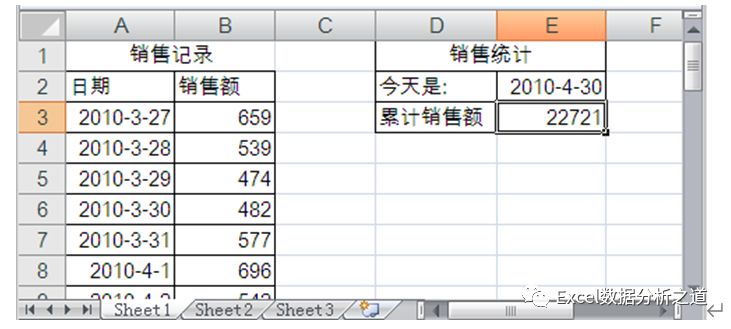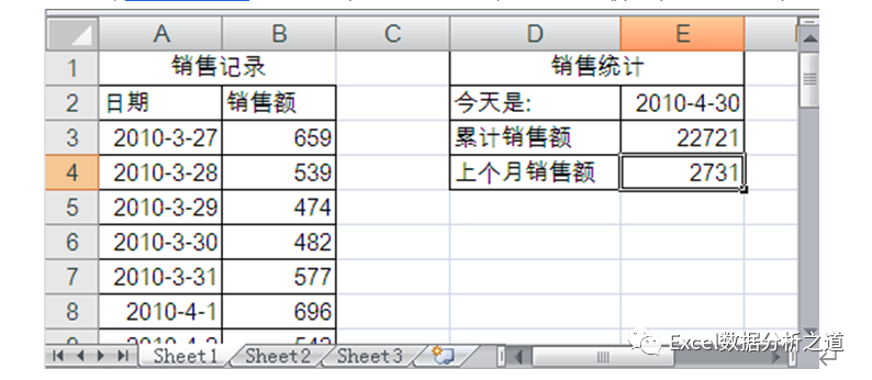 图1-89是一个销售流水账,现在要求动态计算截止到今天的累计销售额,此时,单元格E1和E2的计算公式分别为: