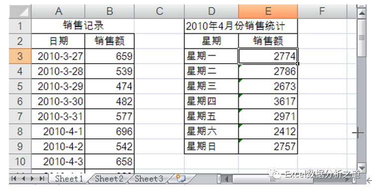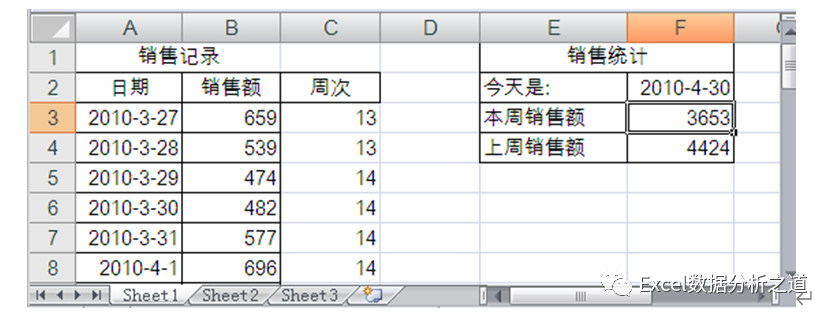 然后就可以根据C列的周次数字进行判断,计算本周和上周的销售总额,公式如下: