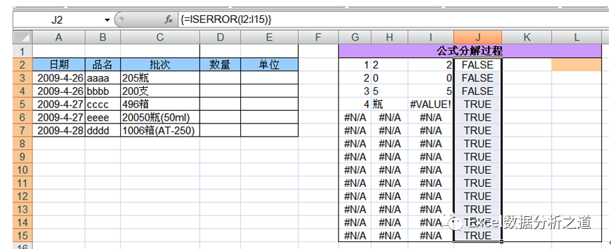 显然,从批次数据左侧开始取出的各个数据,只要开始出现了错误值,就表明从该字符开始就是单位了,因此需要判断从那个位置开始出现了错误值:选择单元格区域J2:J15,输入数组公式“=ISERROR(I2:I15)”,如图1-76所示。